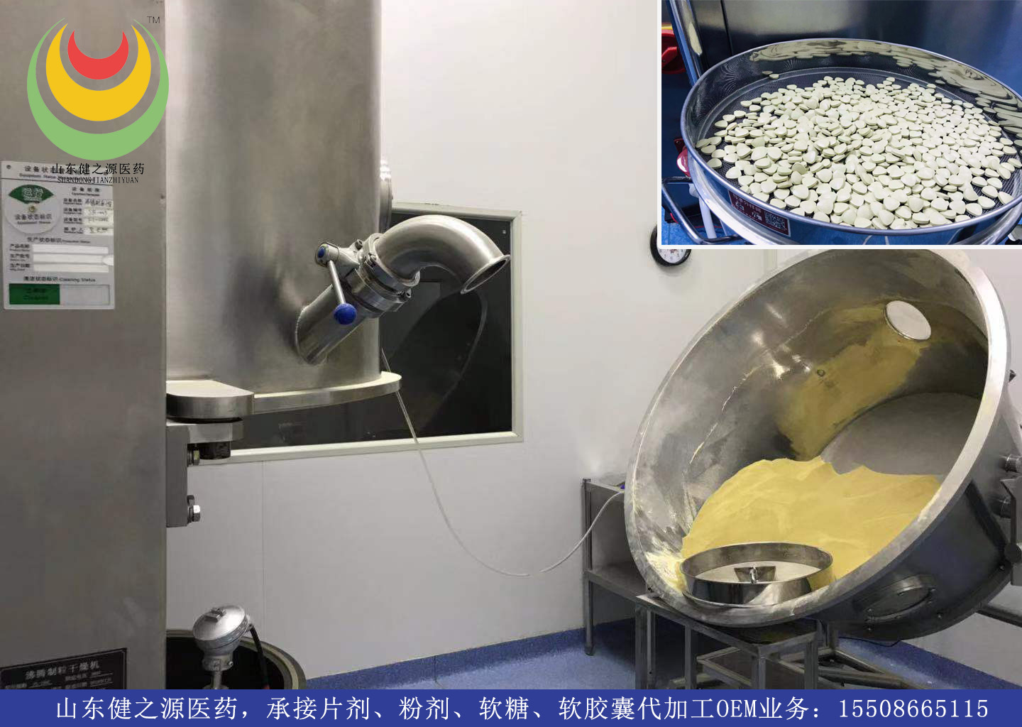 山东健之源压片糖果加工厂此工艺和下一环节的制粒干燥采用的是一步制粒设备,可直接将混合好的物料投入,沸腾起来后可以喷洒糖浆形成制粒,然后再烘干,水分达到标准后可出料。将之前中间几环节的工艺集合到一个设备上,大大提高压片加工的效率。而且物料也会更加均匀,避免了交叉污染。同时温度,风速还可以对应物料就行调节。保证物料有效成分不流失。